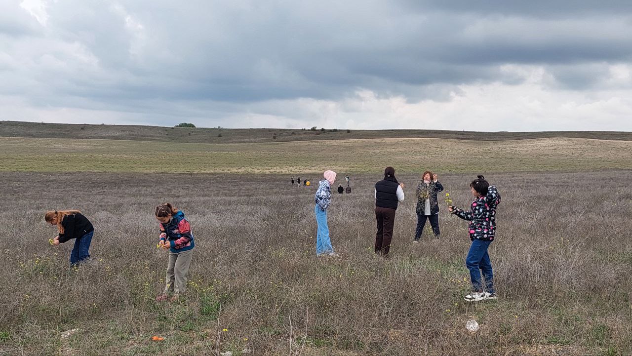 Девочки же увлеклись формированием букетов из свежих цветов и сухоцветов. На фотографии виден процесс сбора, а на дальнем плане – наши «авиаторы»: