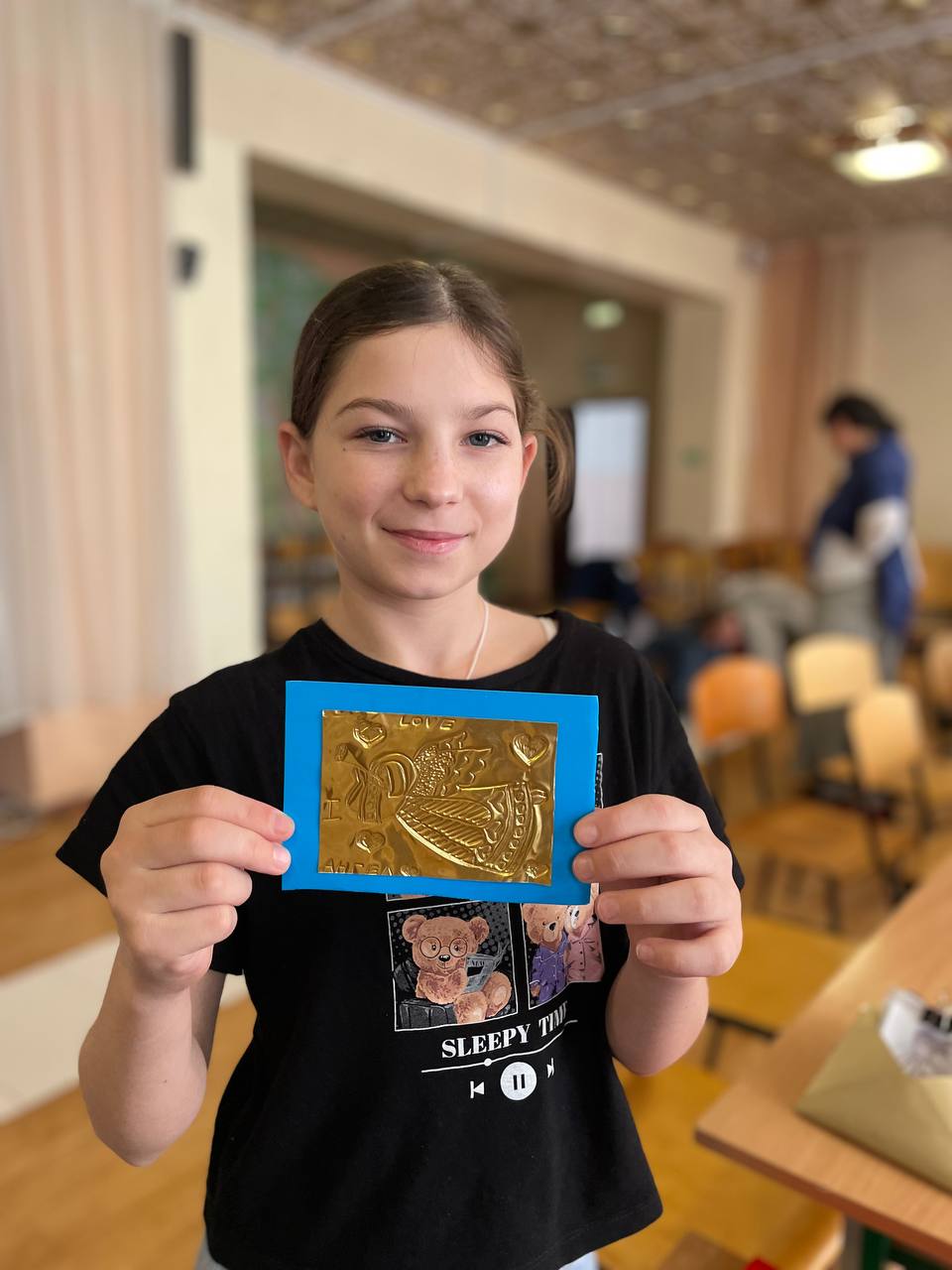 Использовали специальную фольгу для чеканки. Рисунки – на выбор: ангел, птичка, цветы, бабочка. Кто знает, может такое первое знакомство с чеканкой как видом декоративно-прикладного искусства в будущем перерастёт в серьёзное хобби или даже профессию. Всем авторам их работы, обрамлённые в специальные рамочки, были подарены на память: