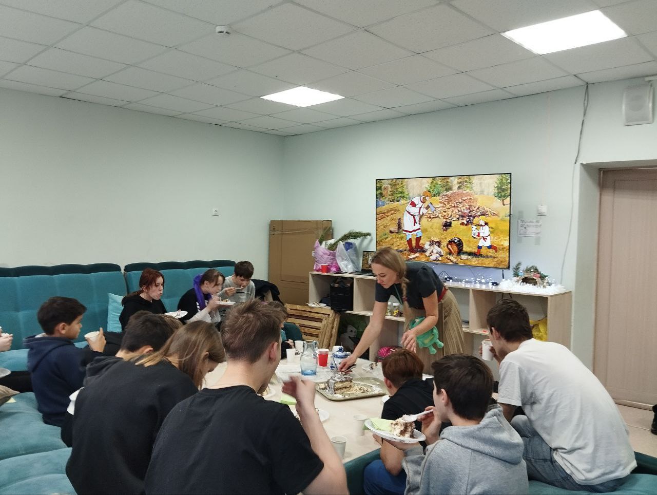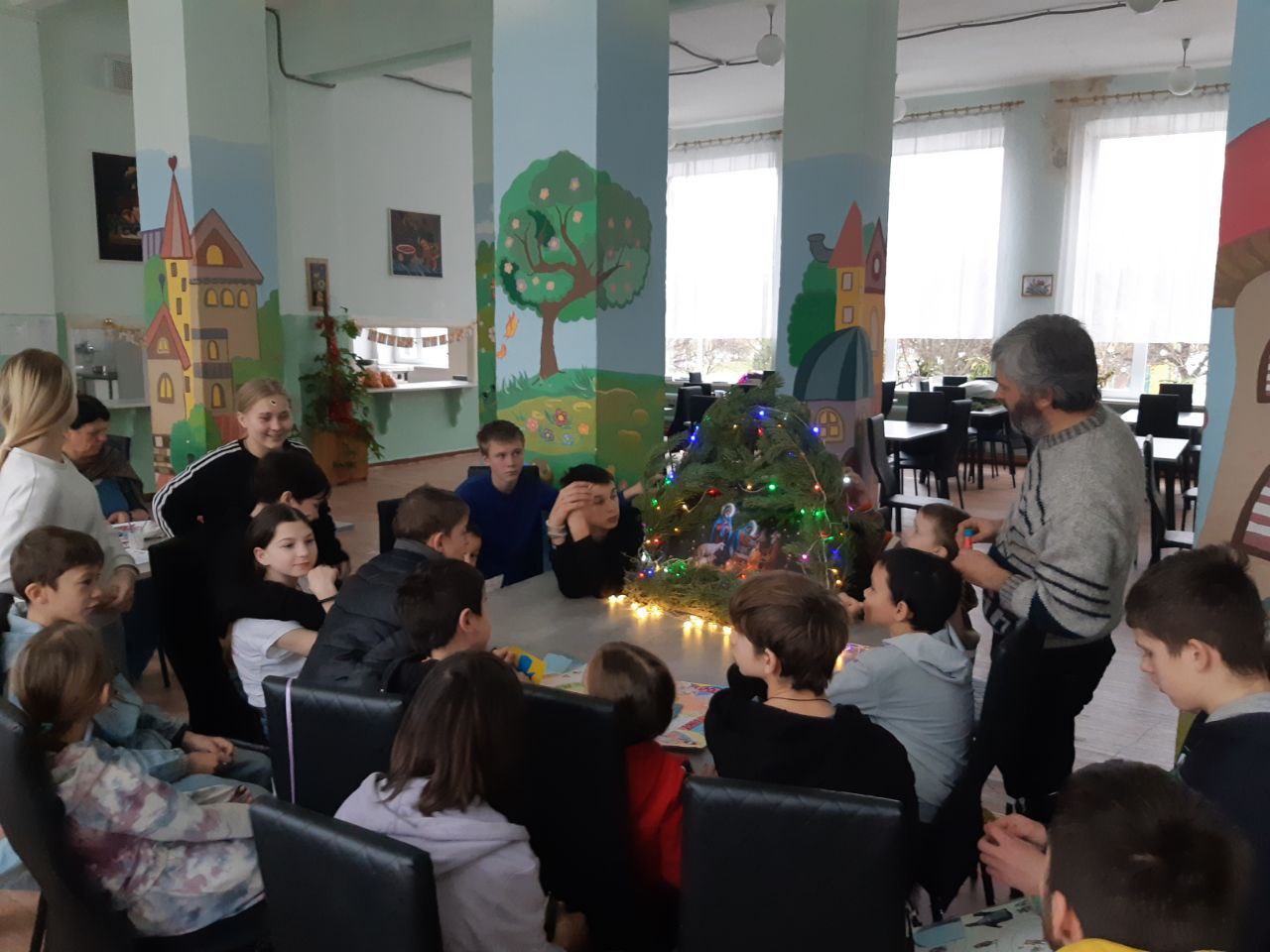 Почти все декабрьские предрождественские встречи завершались чаепитием с приготовленными в монастырской пекарне угощениями. Ниже на фото момент чаепития в Лозовом: ели вкусный торт, общались и смотрели привезённый прихожанами православный мультфильм: